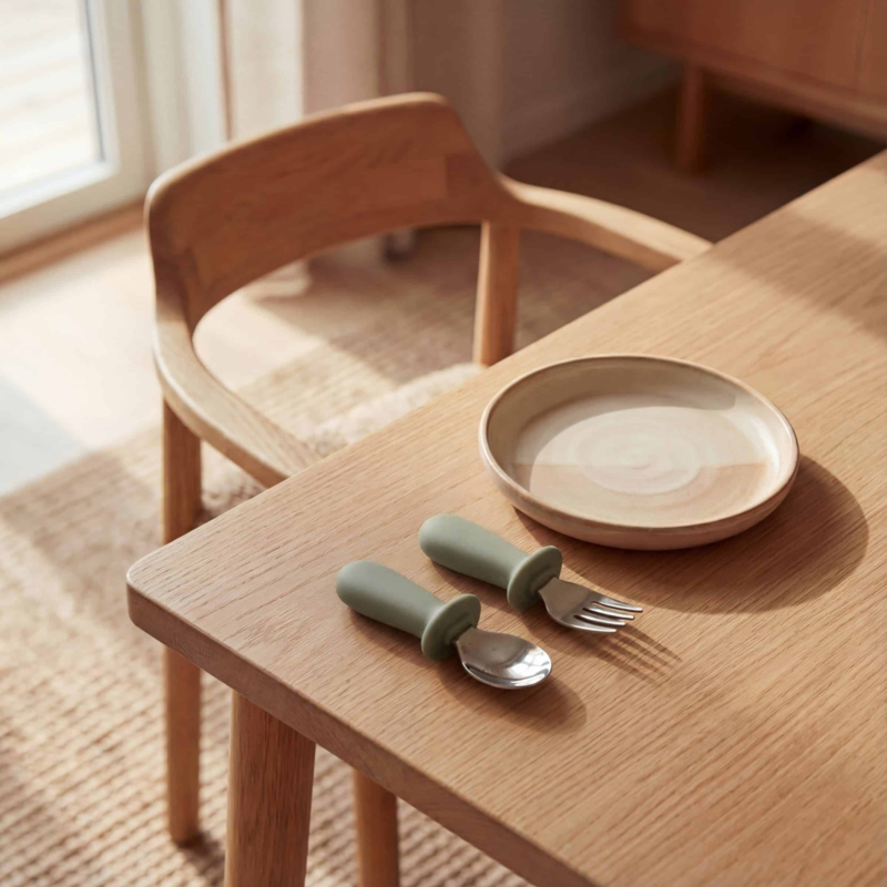 De set bevat een vork en lepel en combineert premium materialen met een kindvriendelijk design.